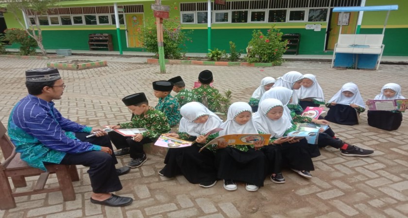 Para siswa ini diberikan tugas oleh guru kelas untuk membaca sebuah buku bacaan yang dipinjam di perpustakaan madrasah. Sambil duduk para siswa membaca dengan santai buku yang dipegangnya, Kamis (14/09/23).
